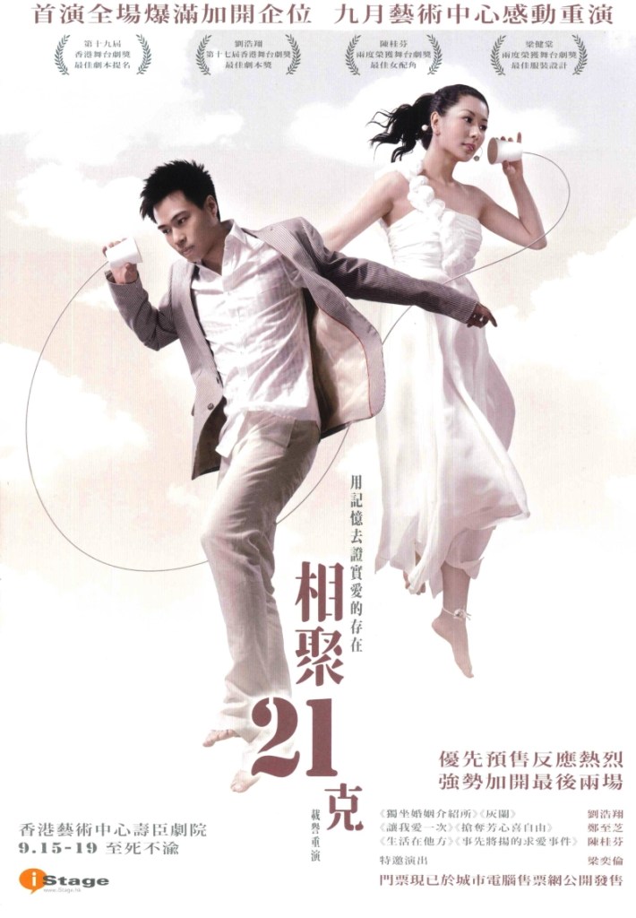 去年今日,剛好就是「相聚21克」首演的日子。今年,此劇可以再度公演,真是既巧合又幸運。首演的票房很好,五場演出爆滿之餘,還要加開企位。去年的製作,在沒有得獎無數的陣容,沒有強大的宣傳攻勢,只由一個業餘劇團 (楚城) 跟半職業的劇場組織 (iStage) 合作的演出,在票房上能有這成績,是難能可貴的。而更重要的是,觀眾的反應亦很好。此劇的內容,表現手法及演員動人的演出,深深的感動了他們。