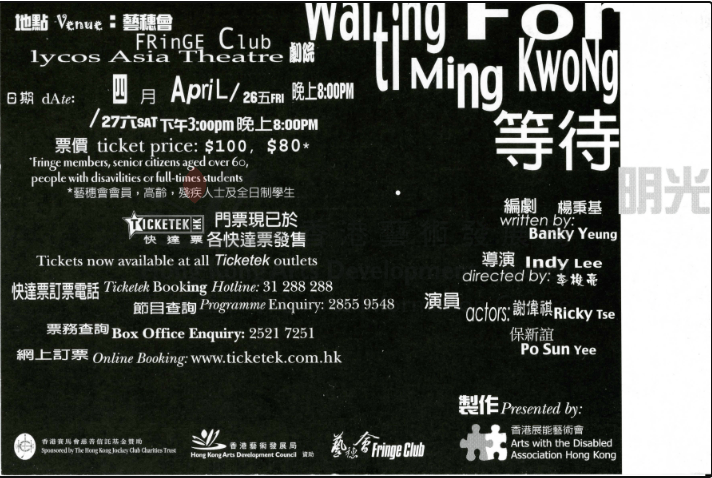 Waiting for Ming Kwong is a theatrical production that explores the theme of blindness—both literal and metaphorical—and how individuals face adversity in different ways. Some characters embrace their circumstances with optimism, while others struggle with a longing for the past. The play features visually impaired actors, Bao Xinyi and Ricky Tse, who integrate their personal experiences into their performances.